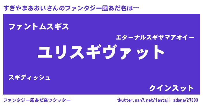 | 男性向けラノベタイトル風あだ名 | 『すぎやまあおい~年齢イコール彼女いない歴の魔法使い~』 |