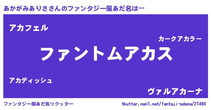 | 胡散臭い通販商品みたいなあだ名 | 『信頼と実績のサプリメント…その名も「あかがみありさ」』 |