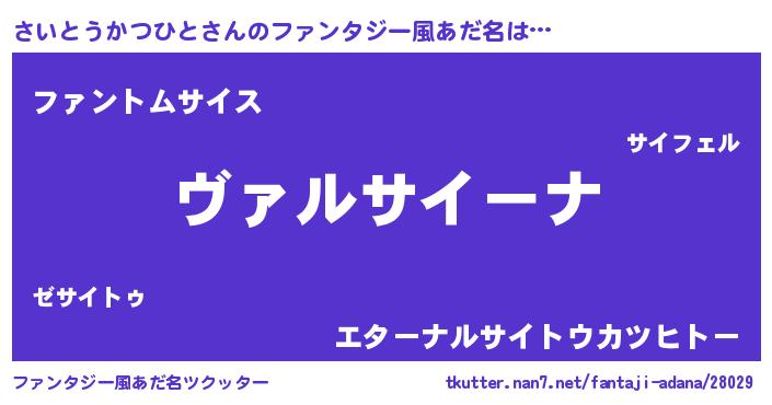 | 男性向けラノベタイトル風あだ名 | 『魔弾の王とさいとうかつひと』 |