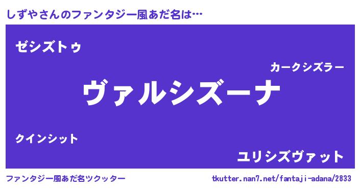 | 男性向けラノベタイトル風あだ名 | 『この素晴らしい世界にしずやを!』 |