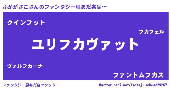 | 男性向けラノベタイトル風あだ名 | 『ふかがさこ~年齢イコール彼女いない歴の魔法使い~』 |