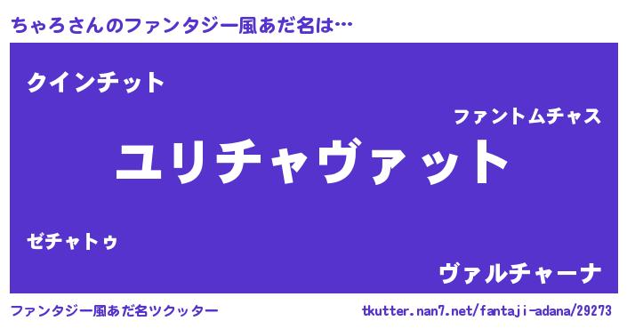 | 男性向けラノベタイトル風あだ名 | 『ちゃろ~年齢イコール彼女いない歴の魔法使い~』 |