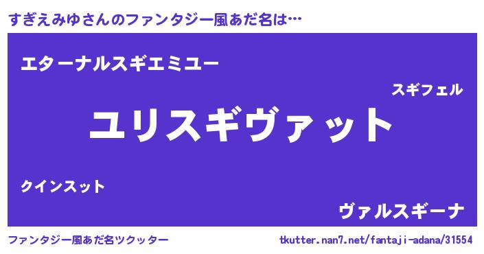 | 男性向けラノベタイトル風あだ名 | 『すぎえみゆ~年齢イコール彼女いない歴の魔法使い~』 |