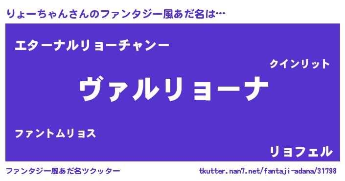 | 男性向けラノベタイトル風あだ名 | 『この素晴らしい世界にりょーちゃんを!』 |