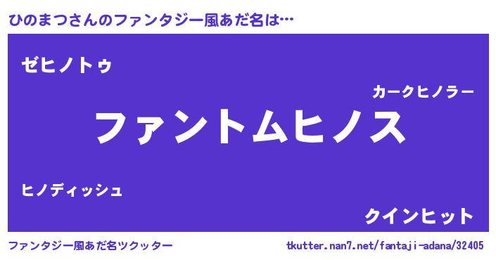 | 男性向けラノベタイトル風あだ名 | 『ひのまつの嫁は女の子じゃないと思った?』 |