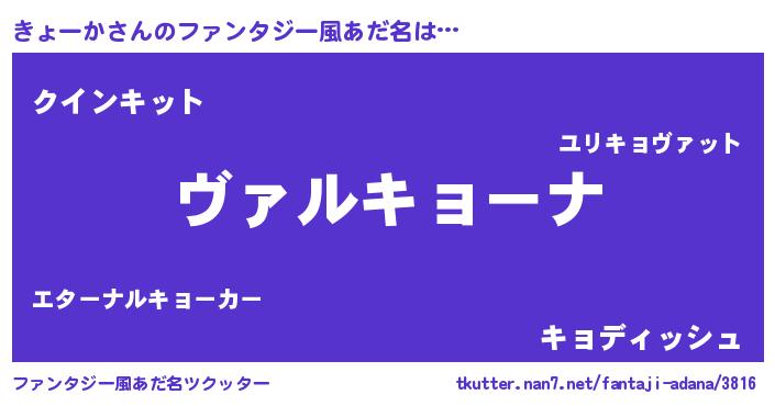 | 男性向けラノベタイトル風あだ名 | 『魔弾の王ときょーか』 |