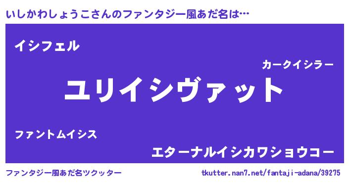 | 男性向けラノベタイトル風あだ名 | 『いしかわしょうこ~年齢イコール彼女いない歴の魔法使い~』 |
