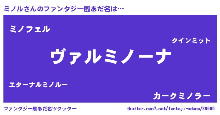 | 男性向けラノベタイトル風あだ名 | 『魔弾の王とミノル』 |