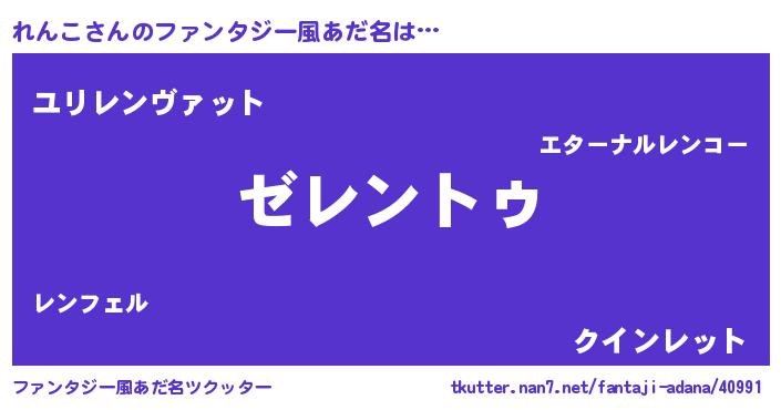 | 男性向けラノベタイトル風あだ名 | 『Re:れんこから始める異世界生活』 |