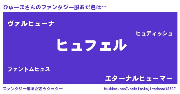 | 男性向けラノベタイトル風あだ名 | 『ひゅーまの憂鬱』『魔弾の王とひゅーま』 |