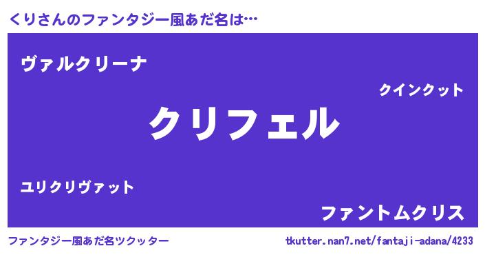 | 男性向けラノベタイトル風あだ名 | 『くりの憂鬱』『魔弾の王とくり』 |