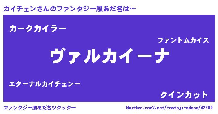 | 男性向けラノベタイトル風あだ名 | 『魔弾の王とカイチェン』 |