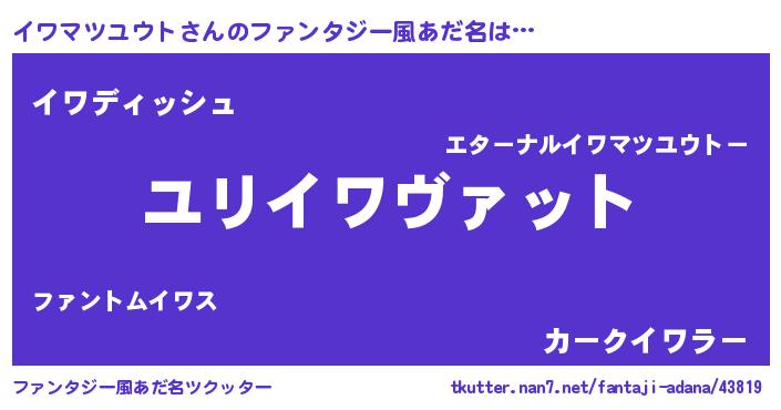 | 男性向けラノベタイトル風あだ名 | 『イワマツユウト~年齢イコール彼女いない歴の魔法使い~』 |