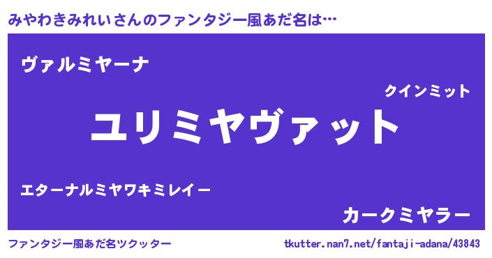 | 男性向けラノベタイトル風あだ名 | 『みやわきみれい~年齢イコール彼女いない歴の魔法使い~』 |