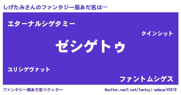 | 男性向けラノベタイトル風あだ名 | 『Re:しげたみから始める異世界生活』 |