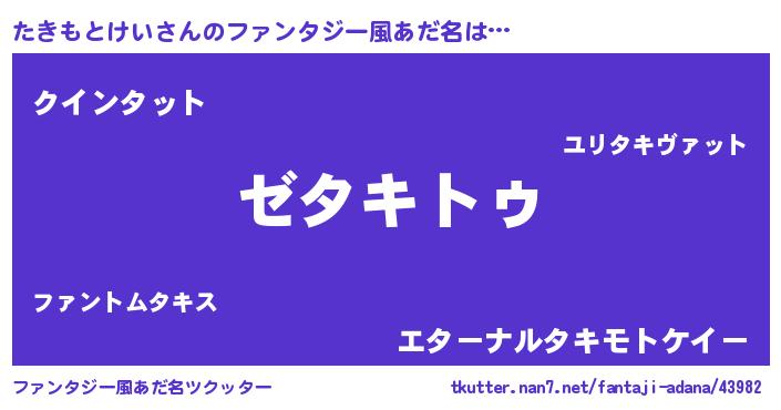 | 男性向けラノベタイトル風あだ名 | 『Re:たきもとけいから始める異世界生活』 |