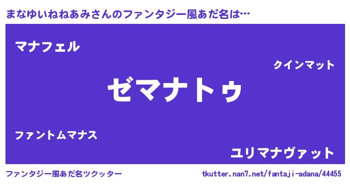 | 男性向けラノベタイトル風あだ名 | 『Re:まなゆいねねあみから始める異世界生活』 |