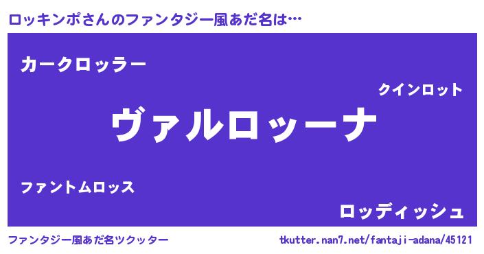 | 男性向けラノベタイトル風あだ名 | 『魔弾の王とロッキンポ』 |