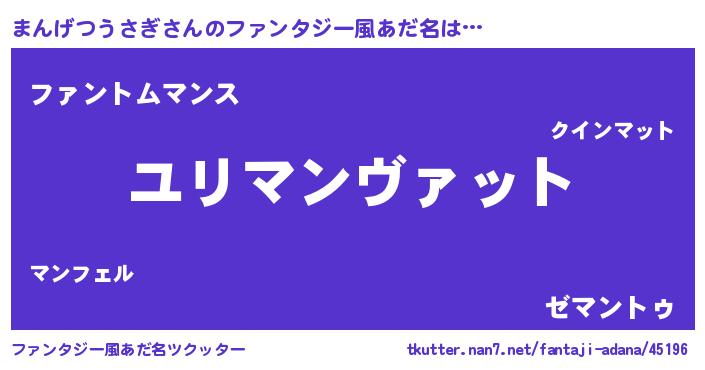 | 男性向けラノベタイトル風あだ名 | 『まんげつうさぎ~年齢イコール彼女いない歴の魔法使い~』 |