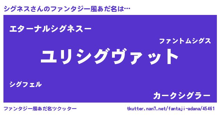 | 男性向けラノベタイトル風あだ名 | 『シグネス~年齢イコール彼女いない歴の魔法使い~』 |