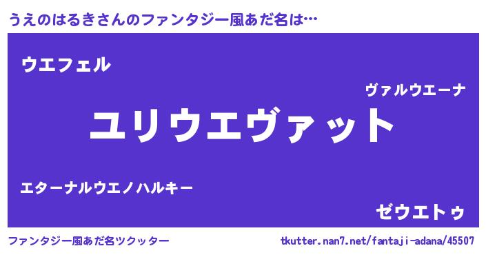 | 男性向けラノベタイトル風あだ名 | 『うえのはるき~年齢イコール彼女いない歴の魔法使い~』 |