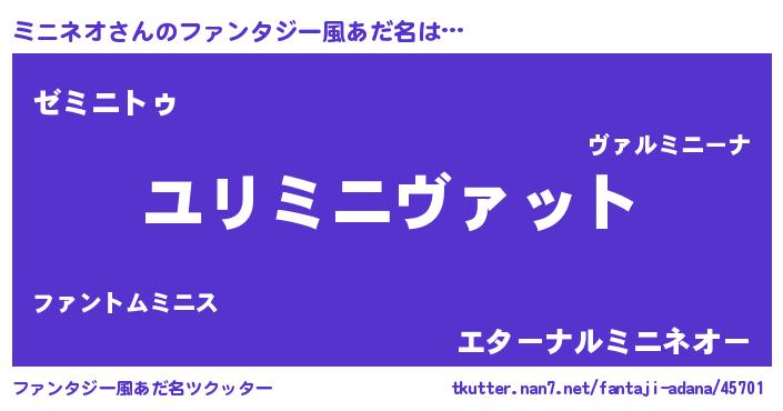 | 男性向けラノベタイトル風あだ名 | 『ミニネオ~年齢イコール彼女いない歴の魔法使い~』 |