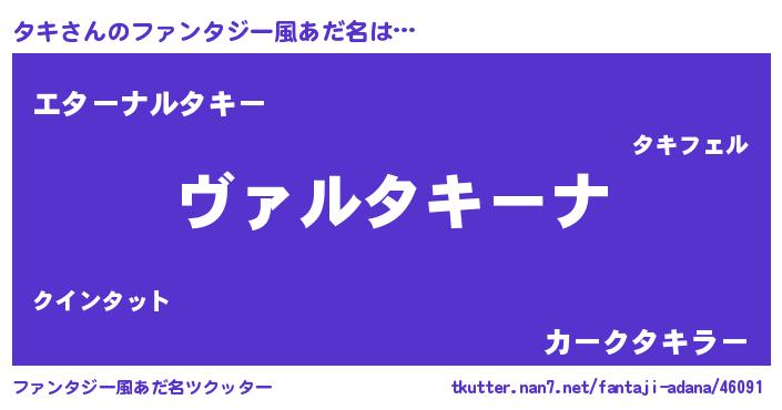 | 男性向けラノベタイトル風あだ名 | 『この素晴らしい世界にタキを!』 |