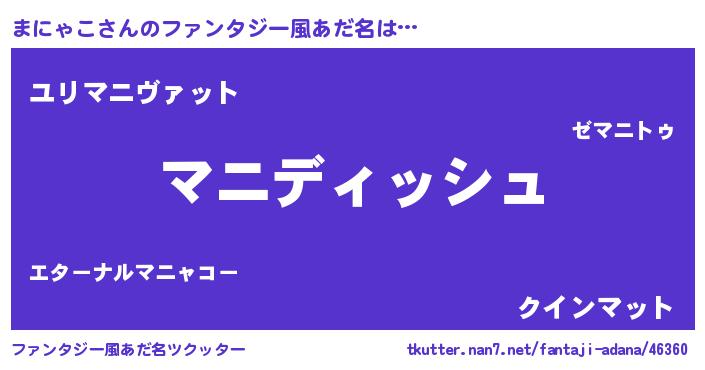 | 女子向けラノベタイトル風あだ名 | 『まにゃこの契約王妃』『闇のまにゃこ』 |