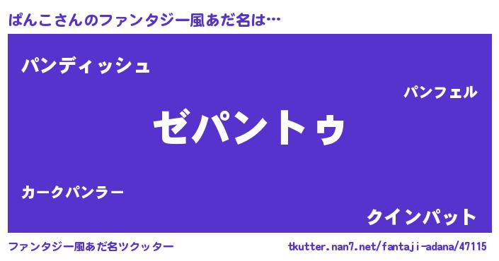 | 男性向けラノベタイトル風あだ名 | 『Re:ぱんこから始める異世界生活』 |