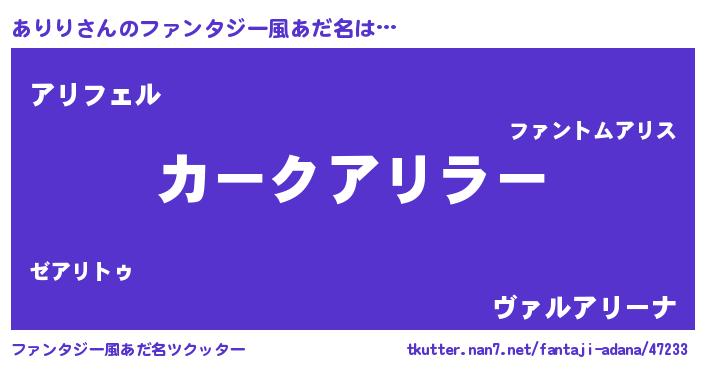 | 男性向けラノベタイトル風あだ名 | 『うちのありりが世界を掌握している!』 |
