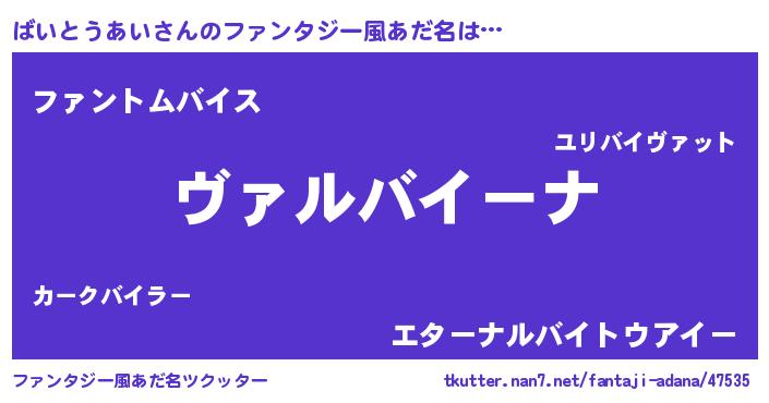 | 女子向けラノベタイトル風あだ名 | 『乙女ゲームの破滅フラグしかない悪役ばいとうあいに転生してしまった…』 |