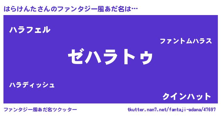 | 男性向けラノベタイトル風あだ名 | 『Re:はらけんたから始める異世界生活』 |