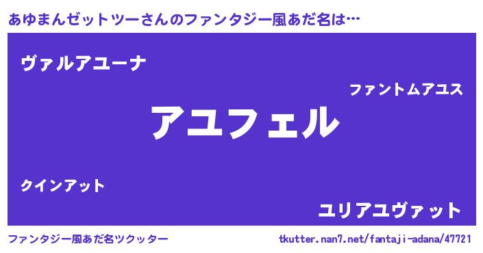 | 男性向けラノベタイトル風あだ名 | 『アユマンゼットツーアートオンライン』 |