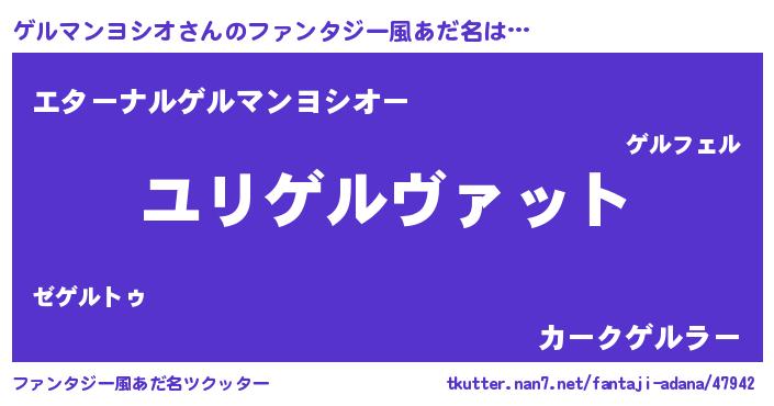 | 男性向けラノベタイトル風あだ名 | 『ゲルマンヨシオ~年齢イコール彼女いない歴の魔法使い~』 |
