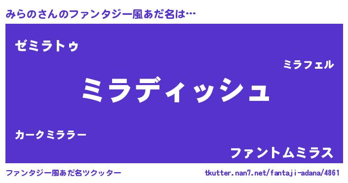 | 男性向けラノベタイトル風あだ名 | 『はたらくみらのさま!』 |