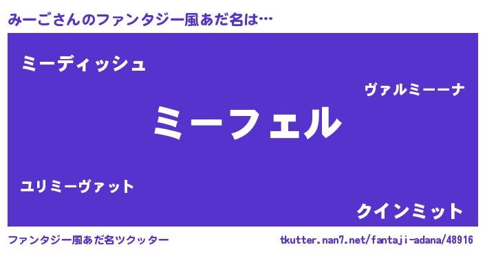 | 男性向けラノベタイトル風あだ名 | 『みーごの憂鬱』『魔弾の王とみーご』 |