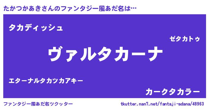 | 男性向けラノベタイトル風あだ名 | 『この素晴らしい世界にたかつかあきを!』 |