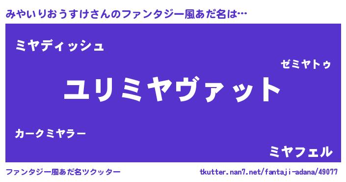 | 男性向けラノベタイトル風あだ名 | 『ミヤイリオウスケスレイヤー』 |