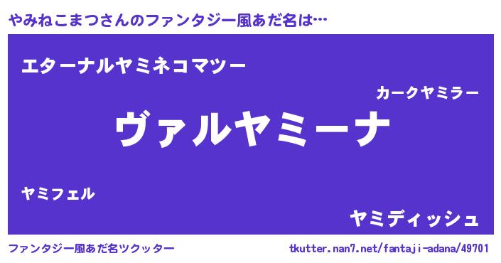 | 男性向けラノベタイトル風あだ名 | 『この素晴らしい世界にやみねこまつを!』 |