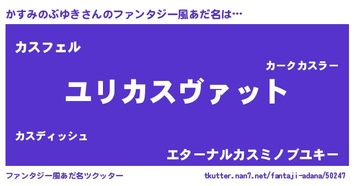 | 男性向けラノベタイトル風あだ名 | 『かすみのぶゆき~年齢イコール彼女いない歴の魔法使い~』 |