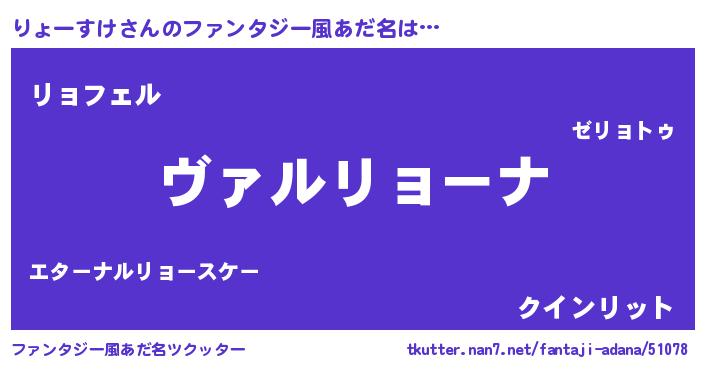 | 男性向けラノベタイトル風あだ名 | 『魔弾の王とりょーすけ』 |