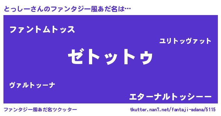 | 男性向けラノベタイトル風あだ名 | 『Re:とっしーから始める異世界生活』 |
