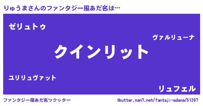 | 男性向けラノベタイトル風あだ名 | 『おまえをオタクにしてやるから、俺をりゅうまにしてくれ! 』 |
