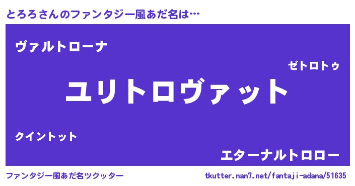 | 男性向けラノベタイトル風あだ名 | 『とろろ~年齢イコール彼女いない歴の魔法使い~』 |