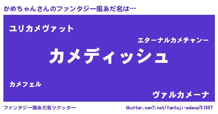 | 女子向けラノベタイトル風あだ名 | 『異世界で失敗しない100のかめちゃん』 |