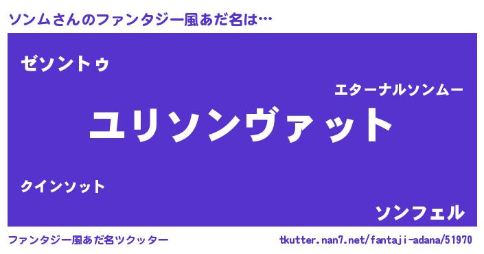 | 男性向けラノベタイトル風あだ名 | 『ソンム~年齢イコール彼女いない歴の魔法使い~』 |