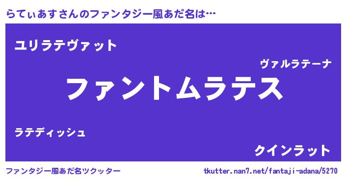 | 男性向けラノベタイトル風あだ名 | 『らてぃあすの嫁は女の子じゃないと思った?』 |