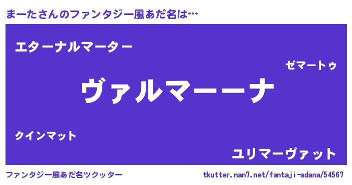 | 男性向けラノベタイトル風あだ名 | 『魔弾の王とまーた』『マータスレイヤー』 |