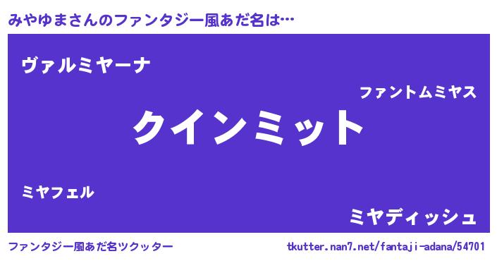 | 男性向けラノベタイトル風あだ名 | 『おまえをオタクにしてやるから、俺をみやゆまにしてくれ! 』 |