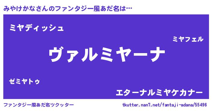 | 男性向けラノベタイトル風あだ名 | 『魔弾の王とみやけかな』 |